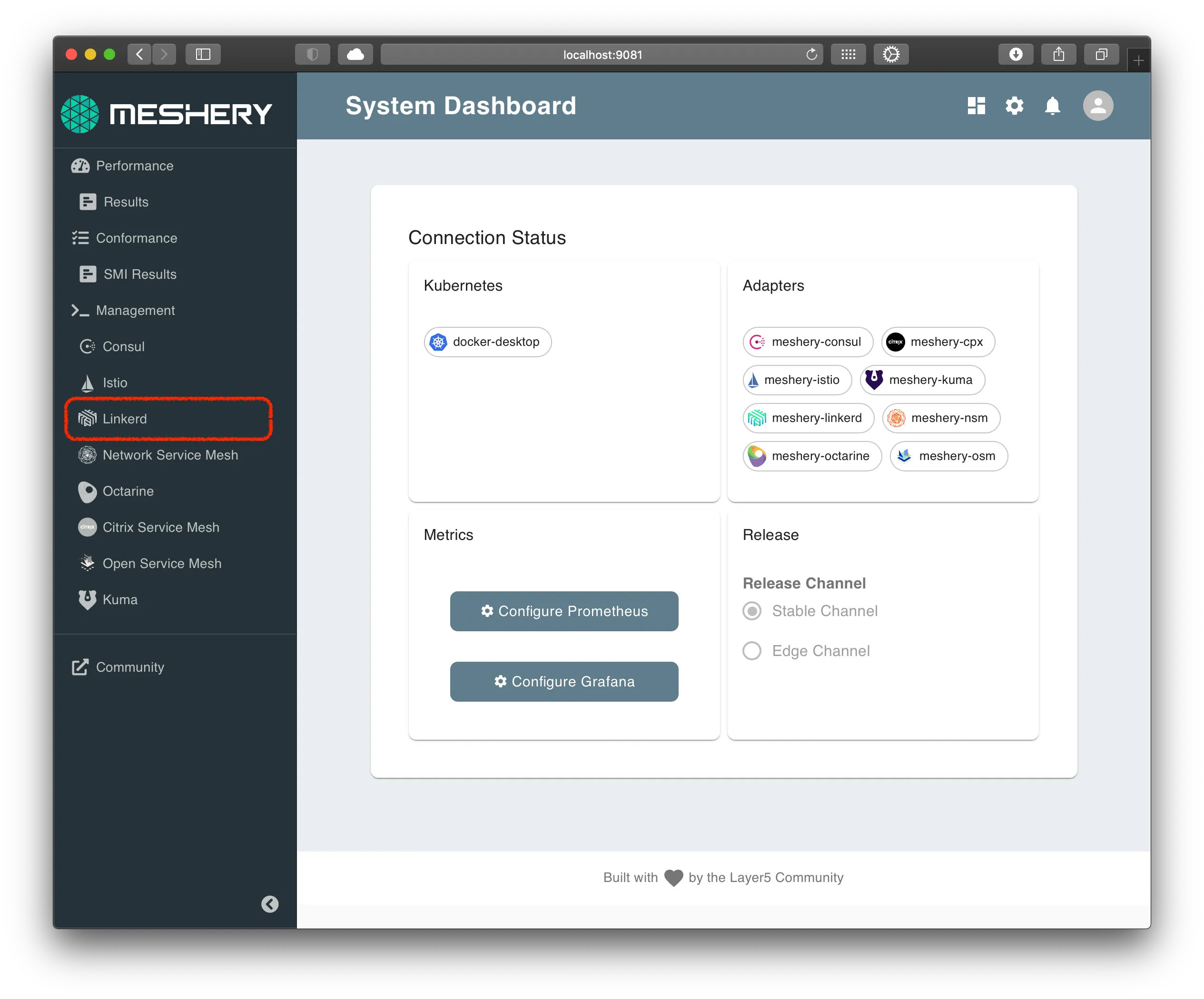Using Meshery, select Linkerd from the Management menu.